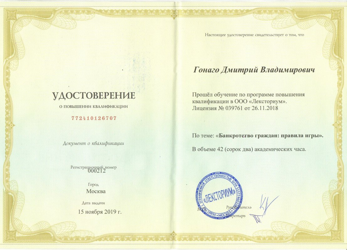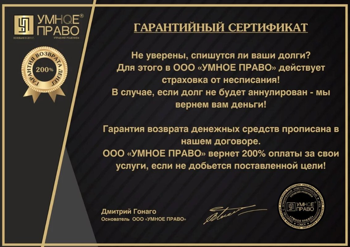 Хочу выразить огромную благодарность высокому профессионалу своего дела - Дмитрию Владимировичу Гонаго, руководителю ООО «УМНОЕ ПРАВО», за освобождение меня от непосильных долговых обязательств!